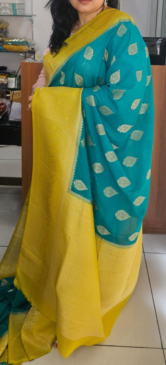Fabric-Georgette, its a lightweight, flowy fabric known for its soft, and graceful drape.