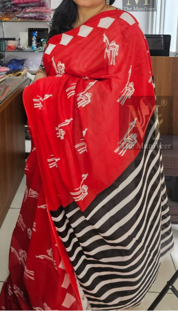 A Mul cotton hand block print saree is a beautifully crafted traditional Indian garment made from a soft, breathable blend of cotton. The saree features intricate hand-block printed patterns, where skilled artisans carefully stamp designs onto the fabric using hand-carved wooden blocks.