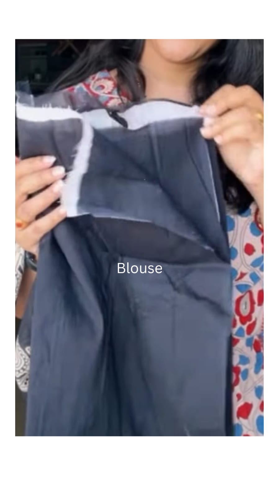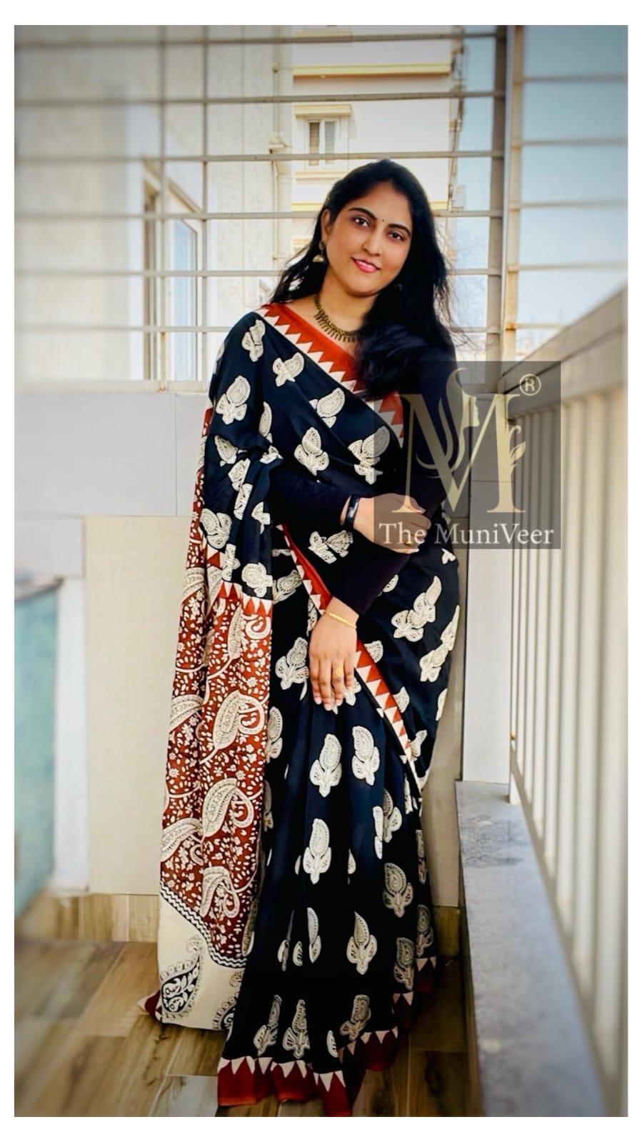 Mul cotton saree with black and red border, leaves on the saree high lights the look.